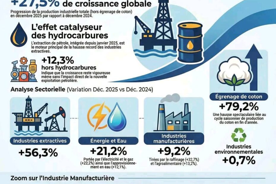 En décembre 2025, la production industrielle au Sénégal a augmenté de 27,5 % par rapport à décembre 2024, selon l’Indice Harmonisé de la Production Industrielle (IHPI) publié par l’ANSD. IHPI – Décembre 2025 : La… HPI – Décembre 2025 : La production industrielle progresse fortement.